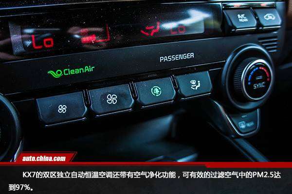 KX7的雙區(qū)獨(dú)立自動(dòng)恒溫空調(diào)還帶有空氣凈化功能,可有效的過(guò)濾空氣中的PM2.5達(dá)到97%。