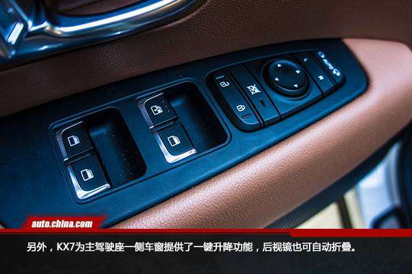另外,KX7為主駕駛座一側(cè)車窗提供了一鍵升降功能,后視鏡也可自動(dòng)折疊。