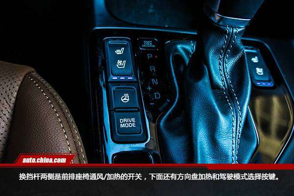換擋桿兩側(cè)是前排座椅通風(fēng)、加熱的開關(guān),下面還有方向盤加熱和駕駛模式選擇按鍵。