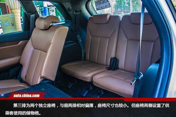 第三排為兩個(gè)獨(dú)立座椅,與前兩排相對(duì)偏薄,座椅尺寸也較小,不過(guò)座椅兩側(cè)設(shè)置了供乘客使用的儲(chǔ)物格。
