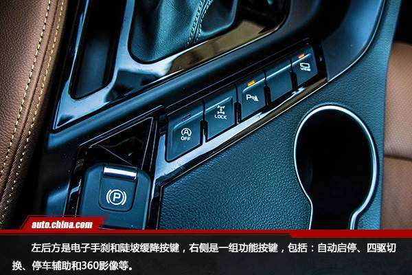 左后方是電子手剎和陡坡緩降按鍵,右側(cè)是一組功能按鍵,包括:自動(dòng)啟停、四驅(qū)切換、停車輔助和360影像等。