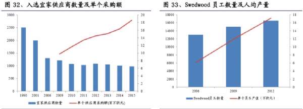為了保持產品的零售終端的價格優勢,宜家在銷售規模持續增長的背景下,一方面不斷減少入圍供應商的數量,提高單個供應商的供貨能力和規模經濟水平;入選的供應商通常能夠得到大訂單,這種由世界各地大批量集體采購方式獲取較低的價格。1990-2015年,入選宜家供應商數量由2500個減少到978個,數量減少超過60%;同時,宜家供應商平均采購額也迅速上升,由2009年的900萬歐元上升至1800萬歐元,平均采購額翻番。