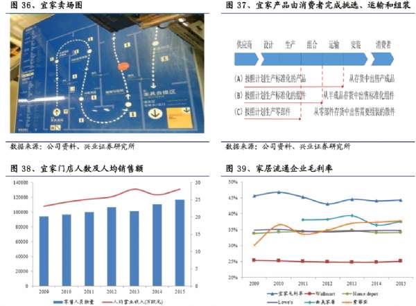 宜家在全球的零售業務通過全資直轄店和特許經營連鎖店兩種模式經營,特許經營權由inter IKEA Systems B.V.作為擴展計劃的一部分進行授予,宜家零售店目前的平均占地面積約為35000 平方米,高于Home depot家具倉儲門店的10000平米。
