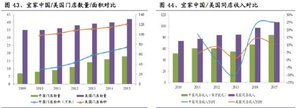 對比宜家中國/美國,兩者已經進入不同的發展模式:外延方面,2009年以來宜家美國總門店數和面積增速(2%-3%)大致保持穩定,宜家中國每年1-2 家(增 速約為 15%)的速度擴張。從同店收入角度看,同店增長(10%-15%)已經成為宜家美國的主要增長動力,宜家中國的門店由于同店收入基數小,同店收入水平和增速仍有較大空間。