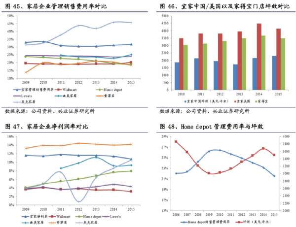 宜家盈利能力相較同類具有顯著優勢,凈利潤高于同類的家具零售商Home depot、 Lowe’s,這主要得益于宜家高效的供應鏈管理及較高的坪效,僅管宜家相應的營銷管理費用率也較高(相較 Home depot 門店面積更大且全球管理運營)。隨著營銷管理效率的提高及新開門店的成熟,前期的營銷管理投入逐步帶動后期的坪效上升,宜家的銷售管理費用率進一步攤薄,Home depot表現出類似的趨勢。我們測算宜家中國的坪效相較宜家美國的坪效還具有較大提升空間。