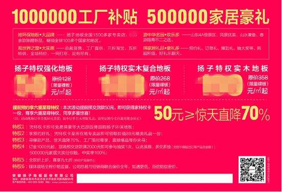 選環(huán)保地板,游中華名園。為了更好地回饋萬千消費者的喜愛和長久以來的支持,揚子地板工廠直供山東專場即將在3月11日火爆開啟,這是揚子地板開年來的第一次大型工廠團購會,也是一次地板的盛宴,春意欣然,揚子地板不僅推出新春特惠價,參與本次團購活動的消費者更能近距離感受4A級風(fēng)景區(qū)的秀麗風(fēng)情!200余款除醛地板新品,超實惠的價格,卓爾不凡的品質(zhì),驚喜接二連三來襲,正挑戰(zhàn)著“底價”的極限,趕緊行動起來吧!