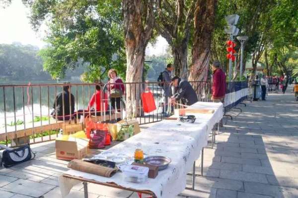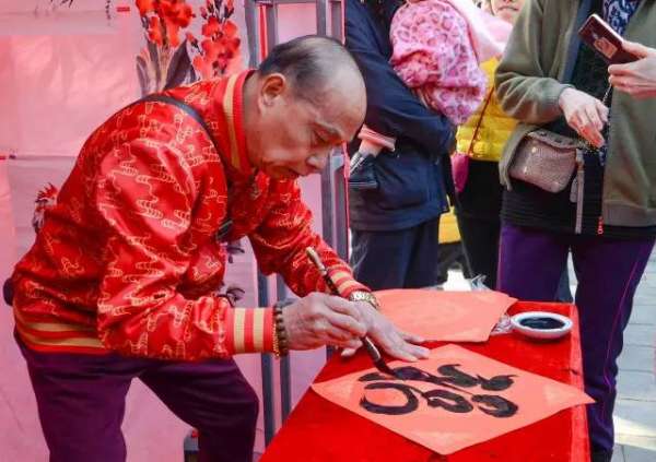 旁邊有書法家在搭桌子準(zhǔn)備寫揮春