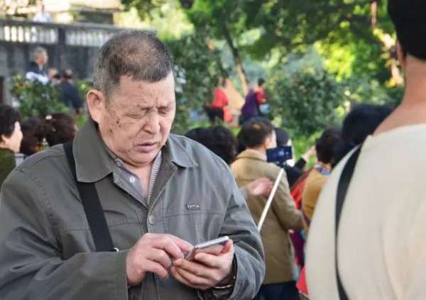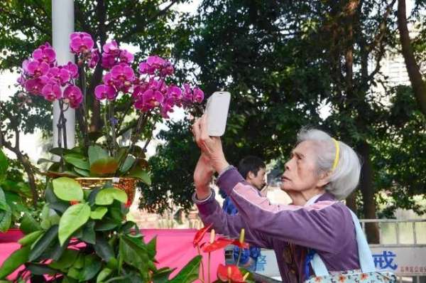 一位白發(fā)蒼蒼的老人拿著手機(jī)對(duì)著蘭花拍拍拍