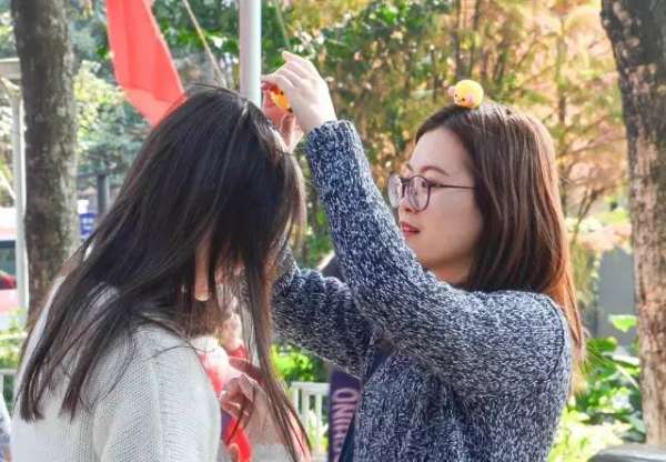 頭戴小雞公仔的女生在為好友戴上另一個(gè)小雞公仔
