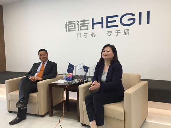 恒潔衛(wèi)浴總裁鄭靈光和高級市場副總裁阮偉華接受媒體采訪