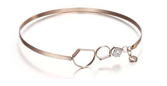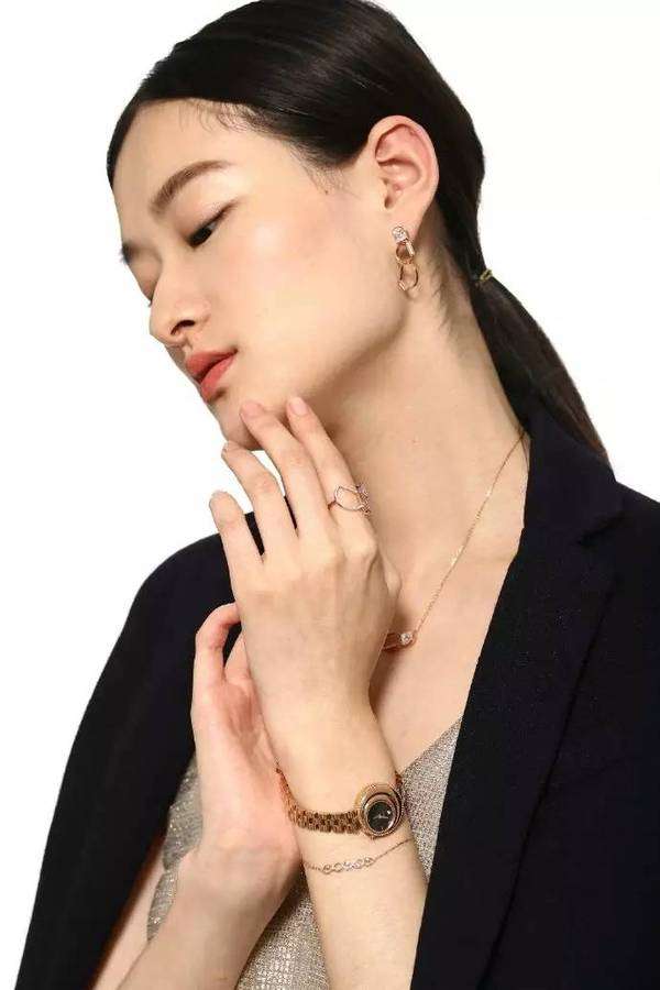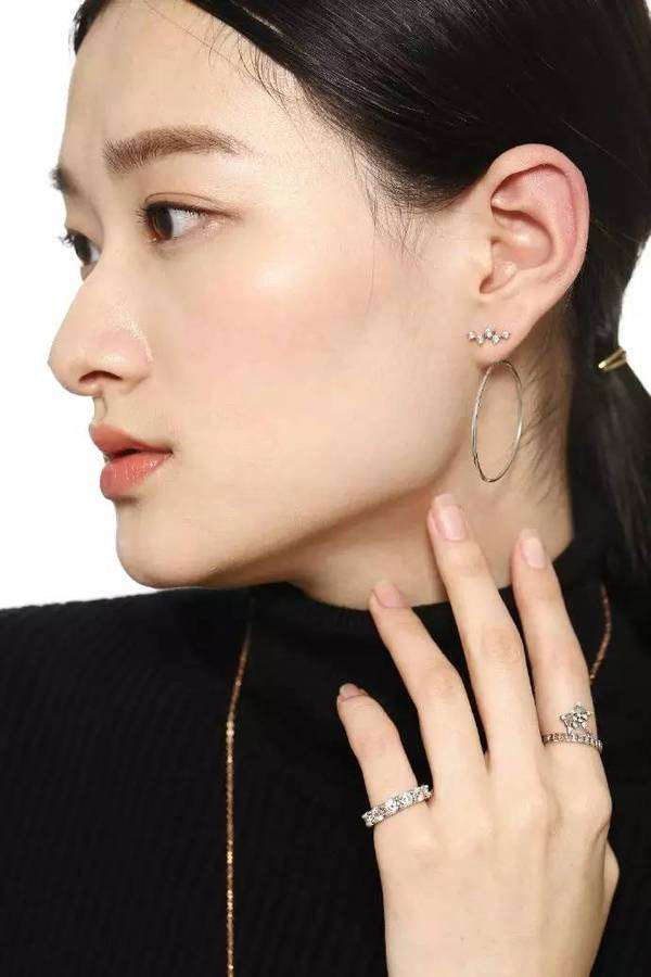 這一個(gè)系列的首飾都是由不規(guī)則的幾何線圈打造的,切割獨(dú)特半圓幾何形圈,后與鉆石顆粒環(huán)環(huán)相連,給人環(huán)環(huán)相扣的感覺,比規(guī)則的圓形更顯俏皮和精致。代言人身上戴的項(xiàng)鏈?zhǔn)窍旅孢@一款,有點(diǎn)像choker的感覺,因?yàn)轭伾呛軆?yōu)雅得玫瑰金,職場女性戴起來也完全ok,但是現(xiàn)在已經(jīng)被賣空了~