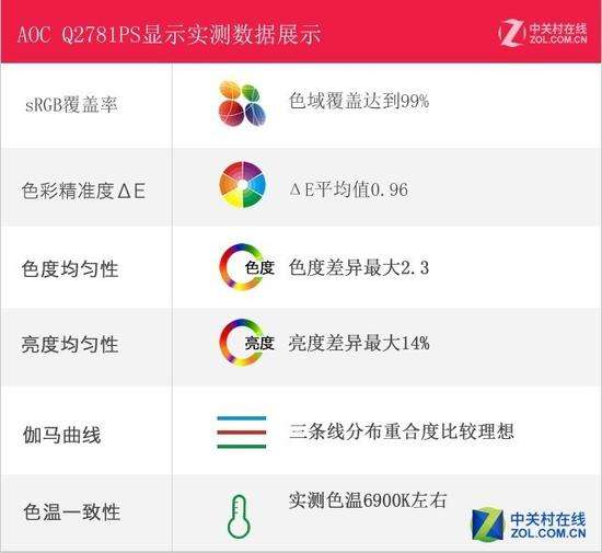 人們對液晶的顯示需求能夠盡可能展現(xiàn)更豐富的顏色之外,另一關(guān)鍵痛點(diǎn)就是擁有精確的色彩還原能力,即需要顯示器能夠把每一種顏色真實(shí)的反映在顯示屏幕上。下面我們就來看看AOC\u00A0Q2781PS的色彩還原能力。色彩還原準(zhǔn)確性的指標(biāo)在業(yè)界中采用ΔE值來體現(xiàn),ΔE能夠?qū)⑸蔬原的準(zhǔn)確性量化為一個數(shù)值,它能夠精確反映顯示器表現(xiàn)色彩的準(zhǔn)確性。