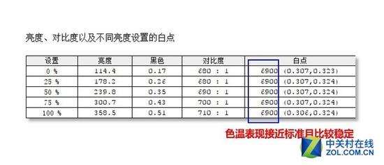 接下來,我們進(jìn)行色溫一致性的測試的目的在于考驗(yàn)顯示器在不同亮度下白點(diǎn)色溫的穩(wěn)定性,用戶可能會隨時調(diào)節(jié)顯示器的亮度,此時對比度和色溫不應(yīng)該發(fā)生太大的變化。我們分別將AOC\u00A0Q2781PS的亮度調(diào)節(jié)到0%、25%、50%、75%和100%,測試全白畫面亮度和全黑畫面亮度以及色度坐標(biāo),計算出對比度以及色溫值,各個亮度下色溫值和對比度比值不應(yīng)發(fā)生太大變化。