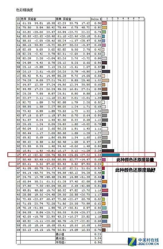 注:ΔE值反映的是顯示器與標(biāo)準(zhǔn)值之間差距的大小,因此其數(shù)值越小越好,分?jǐn)?shù)越高說明色彩越失真。