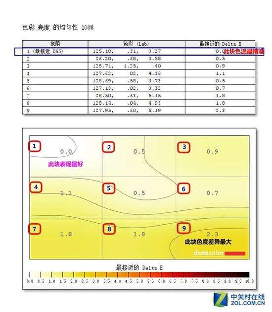 均勻性測試分為亮度均勻性和色度均勻性兩部分。在測試環(huán)節(jié),對屏幕均等劃分為9個區(qū)塊(見圖中標(biāo)注)。校色儀會在測試中測出每個區(qū)塊不同百分比的亮度和色度坐標(biāo)情況的最大差異值,從而確認(rèn)這款顯示器在均勻性方面的表現(xiàn)好壞程度。