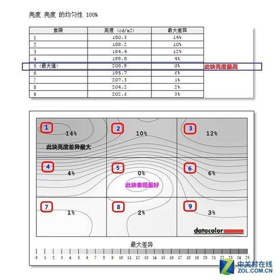 屏幕亮度均勻性的測試同樣借助Spyder\u00A05\u00A0Elite校色儀進(jìn)行測試,將屏幕劃分為9個大區(qū)域,分別測試計算屏幕在每個區(qū)域不同百分比的亮度以及色度坐標(biāo),最終得出以下的結(jié)論。(以下結(jié)果均在IRE輸出達(dá)100%,即使用最大亮度和對比度輸出時進(jìn)行測試的結(jié)果)。