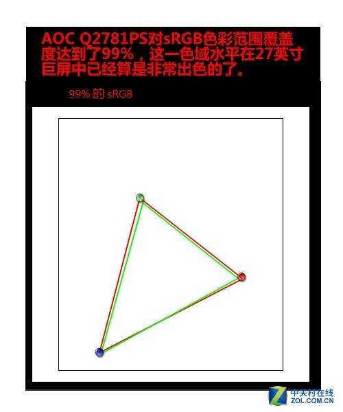 理論而言,紅色的區(qū)域如果完全覆蓋綠色的sRGB色彩空間是最為理想的。而通過實(shí)際測試結(jié)果來看,代表AOC\u00A0Q2781PS色域的紅邊三角形基本完全覆蓋了sRGB全部的色彩空間。AOC\u00A0Q2781PS對sRGB色彩范圍覆蓋度達(dá)到了99%。