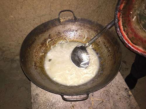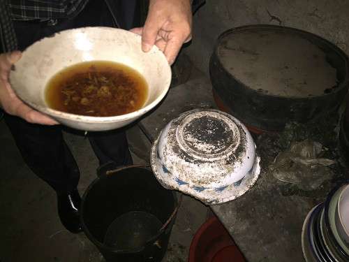 經(jīng)得本人同意,我們被允許進(jìn)入本村無保戶楊雙根的家中一探究竟,只見破舊的木門伴隨著陣陣霉味緩緩打開,眼前的一切著實(shí)讓在場的志愿者們目瞪口呆,漆黑泛著霉味的土坯房里伸手不見五指,用手機(jī)微弱的燈光我們將房間打量了一番,厚厚的灰塵充斥著整個房間,探眼望去沒有一個像樣的家具,灶臺上骯臟不堪,只有一鍋淡而無味的剩面條得以充饑,據(jù)村支書說像如此窘?jīng)r的無保戶,這里還有8家。
