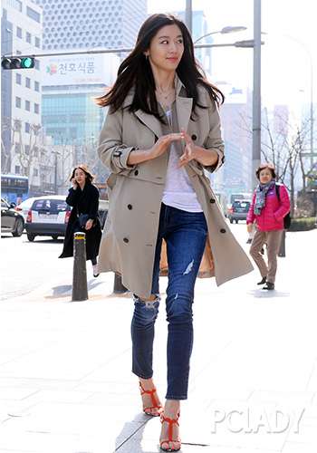 點(diǎn)評(píng):經(jīng)典的卡其色風(fēng)衣,系上腰帶,讓你下半身比例更顯完美~搭配的黑色牛直筒褲子穿上平底鞋,則襯托氣質(zhì)!