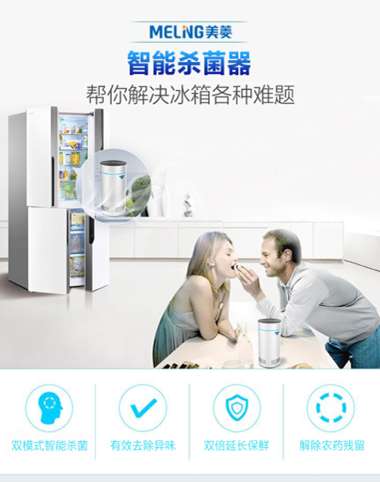 除此之外,美菱還針對冰箱“易生細(xì)菌、保鮮效果差、異味肆虐”的痛點(diǎn)研發(fā)出了“冰箱智能殺菌器”。這款身高103mm,直徑50mm的小巧裝置,能夠通過內(nèi)置