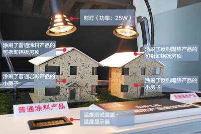 為了驗(yàn)證外墻反射隔熱涂料的節(jié)能降溫效果,立邦工程團(tuán)隊(duì)制作了一套裝置進(jìn)行專業(yè)的測(cè)試。測(cè)試中,通過(guò)設(shè)置同功率、同距離、同角度的射燈照,分別照射涂裝了相同巖彩效果(卡拉麥里金)的普通外墻涂料和外墻反射隔熱涂料的兩個(gè)小房子,以房子內(nèi)溫度判斷材料的隔熱效果。經(jīng)過(guò)實(shí)際操作,在相同的照射時(shí)間下,涂刷了立邦反射隔熱產(chǎn)品的小房子室溫比涂刷普通涂料的小房子室溫低5.6℃,驗(yàn)證了降溫節(jié)能的功效。