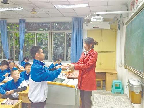 2013年10月16日,老師向學生發(fā)放非智能手機。 (鐵中供圖)