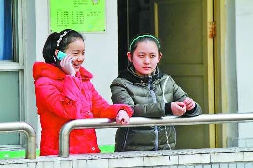 1月13日,鐵路中學,兩位同學在教室門口使用“小藍機”告訴家長放假的時間。 重慶晨報記者 苑鐵力 攝