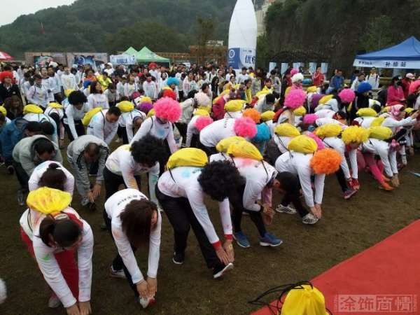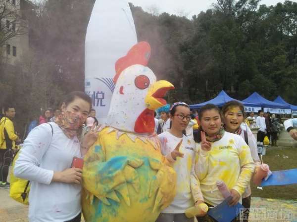 在活動開跑前,不少跑步愛好者本來就用彩色“玉米粉”在臉上和身上化了妝,用各種奇裝異服和道具裝扮自己,為自己創(chuàng)造了一身獨一無二的“彩跑”戰(zhàn)袍,回到終點后,他們更是用彩色玉米粉相互攻擊和涂抹,頭發(fā)上、衣服上、脖子里,到處都經(jīng)歷了五顏六色的洗禮,身著COSPLAY服裝的小公雞更是成為了現(xiàn)場的焦點,連活動的美女主持人都未能幸免。整個活動現(xiàn)場沉浸在五彩繽紛的歡樂海洋中。