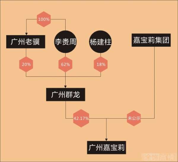 廣州群龍成立時(shí)間比廣州嘉寶莉稍早一周,其實(shí)則李賚周控制下的企業(yè),其股東包括自然人李賚周、楊建柱和法人股東廣州市老驥建筑裝飾有限責(zé)任公司(下稱“廣州老驥”),分別出資322.4萬(wàn)元、93.6萬(wàn)元和104萬(wàn)元;其中廣州老驥為李賚周100%出資設(shè)立的企業(yè),成立于2016年8月。這意味著李賚周直接和間接合并擁有廣州群龍82%的股權(quán)。
