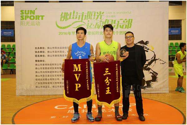 佛山市陽光運動俱樂部副會長蔡奮強先生為“MVP”波西米亞隊6號球員黃耀盟,“三分王”純視監(jiān)控隊8號球員羅家豪頒獎