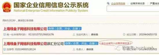 當前,工商注冊系統(tǒng)顯示,上海綠盒子網(wǎng)絡(luò)科技有限公司徐匯分公司已被列入到經(jīng)營異常名錄,做出決定的是,上海市徐匯區(qū)市場監(jiān)督管理局,決定日期是:2016年7月6日。
