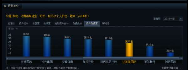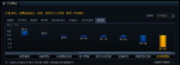 另外據(jù)同花順資料顯示,在其統(tǒng)計(jì)的14家港股服飾、鞋類公司中,2016年中期,達(dá)芙妮凈利潤(rùn)排最后一名。2015年,達(dá)芙妮的排名為第13名。在資產(chǎn)負(fù)債率方面,2016年中期,達(dá)芙妮排名為第12名,具體數(shù)值為23%。