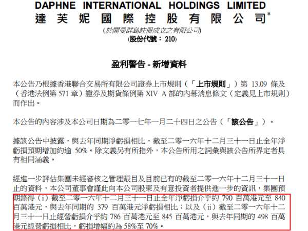 3月3日晚,達(dá)芙妮公布盈利警告新增內(nèi)容,并沒有虧損減少,或者扭虧為盈等反差性過強(qiáng)的字眼,依舊是熟悉的凈虧損增加。其預(yù)計(jì)2016年全年凈虧損在7.9億至8.4億港元之間,華麗麗的超過了此前預(yù)計(jì)的增幅約逾50%(2015:凈虧損3.79億港元,),即超過5.68億港元。與此同時(shí),其經(jīng)營(yíng)虧損在7.86億港元至8.45億港元之間,去年同期為4.98億港元,虧損增幅約為58%至70%。