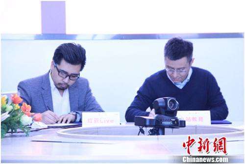 紅豆Live聯合創始人趙作陽與小站教育創始人兼CEO王浩平現場進行簽約