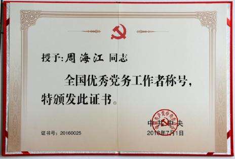 (2016年7月,周海江獲“全國優秀黨務工作者”稱號)