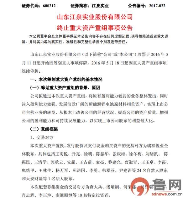 魯網(wǎng)3月9日訊(記者 羅燕)剛剛“脫星摘帽”的山東江泉實業(yè)股份有限公司(江泉實業(yè).600212.SH)今日發(fā)布公告,終止與山東瑞福鋰業(yè)有限公司(瑞福鋰業(yè))的重組計劃,這意味著,江泉實業(yè)耗時將近1年擬收購瑞福鋰業(yè)的“大動作”宣告失敗。
