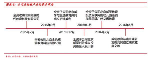 自2014年和君系開始進(jìn)入公司,對威創(chuàng)股份的累積持股比例已經(jīng)接近15%,在和君不斷為公司導(dǎo)入和輸送教育相關(guān)人才的同時,也為公司注入資本運(yùn)作的血液,推動公司走上內(nèi)生與外延相結(jié)合的發(fā)展道路。自2015年開始,公司開啟了在幼教產(chǎn)業(yè)的資本運(yùn)作之路,在2015年2月和9月分別收購了國內(nèi)知名的幼兒園連鎖品牌紅纓教育和金色搖籃,同時自2016開始,分別投資了貝聊,并與啟迪教育和南京康軒成立合資公司,開啟了在家園互動、內(nèi)容研發(fā)以及幼師培訓(xùn)方面的布局。