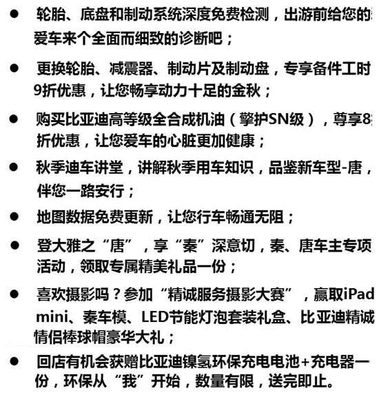 春夏秋冬,呵護(hù)備至!比亞迪精誠(chéng)服務(wù)節(jié)致力為您的愛(ài)車提供無(wú)微不至的呵護(hù)。本次秋季精誠(chéng)服務(wù)節(jié),是為感謝所有顧客對(duì)比亞迪汽車的支持與信賴而開展,讓您盡享“比亞迪精誠(chéng)服務(wù)”帶來(lái)的真誠(chéng)服務(wù)及精湛技術(shù)。