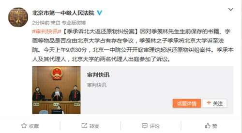 自季羨林于2009年7月去世后,季承一直與北大協(xié)商返還這些文物、字畫(huà)。據(jù)《濟(jì)南時(shí)報(bào)》報(bào)道,在協(xié)商近三年未果的情況下,季承于2012年6月14日通過(guò)郵寄方式向法院寄送了起訴書(shū)。2012年8月3日,此案正式立案。