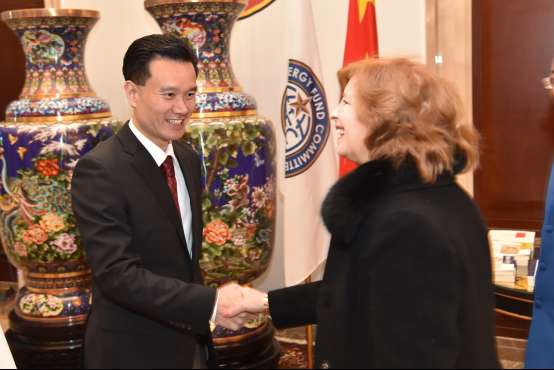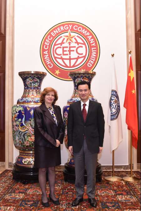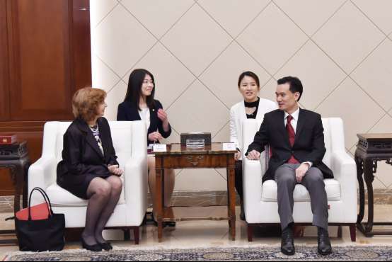 中國(guó)華信董事會(huì)主席葉簡(jiǎn)明與哥倫比亞大學(xué)國(guó)際與公共事務(wù)學(xué)院梅麗特?杰諾會(huì)談。