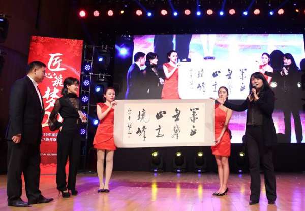 朱紅宇向業(yè)之峰贈送“業(yè)無止境 勇攀高峰”書法作品