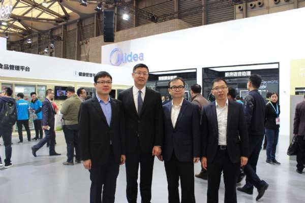 (圖片人物從左到右依次為美的冰箱事業部總經理王建國,美的集團副總裁兼中央研究院院長胡自強,美的生活電器事業部總經理李國林,美的智慧家居科技有限公司總經理李強)