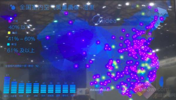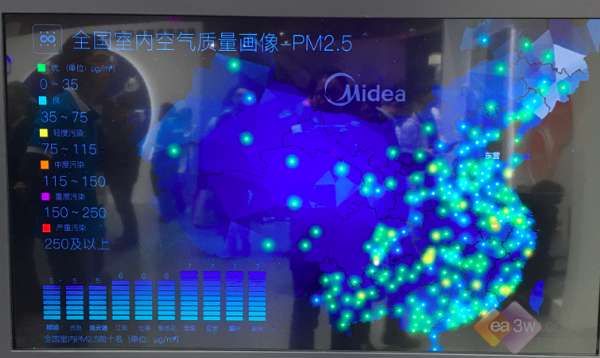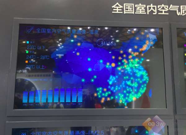 在2017AWE中國家電及消費電子展上,美的就展示了他們在利用大數據與智能家電聯動上取得的成績。在美的展臺,四塊大屏幕成“田”字形排列,這里展示的就是通過美的在全國銷售出去的空氣類智能家電產品收集回來的全國室內空氣質量大數據。