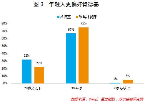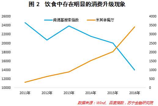 圖2顯示了肯德基搜索指數(shù)和米其林餐廳搜索指數(shù)在近6年的走勢,顯而易見:肯德基搜索指數(shù)不斷下滑,米其林餐廳搜索指數(shù)不斷提升。這說明,隨著我國人均收入穩(wěn)定增長,居民開始擺脫簡單的西式快餐,更加追求餐廳的口味和品質。