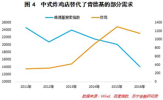 圖4顯示了肯德基搜索指數(shù)和炸雞搜索指數(shù)的走勢。可以發(fā)現(xiàn)2014年和2015年炸雞搜索量暴增,與此對應的是肯德基搜索量持續(xù)下滑,因此,可以說中式炸雞店的流行替代了肯德基的部分需求。