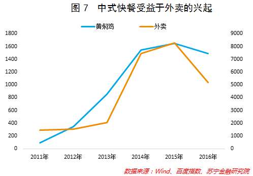 外賣的興起與生活節(jié)奏加快、年輕人的宅習慣等因素有關,同時也帶動了中式快餐的銷售,比如黃燜雞的搜索指數(shù)和外賣的搜索指數(shù)在趨勢上十分一致(參見圖7)。