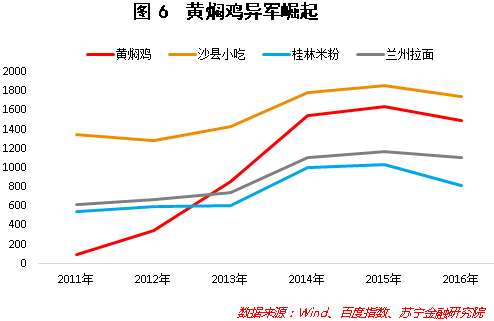 雖然肯德基沒落了,但黃燜雞強勢崛起了。目前中式快餐的四大金剛分別是:沙縣小吃、黃燜雞、蘭州拉面和桂林米粉。從搜索指數(shù)看,2013年黃燜雞的搜索量已經(jīng)超過了蘭州拉面和桂林米粉,2014年更是把蘭州拉面和桂林米粉遠遠甩在了后面,但截至目前,黃燜雞的搜索量還沒有超過沙縣小吃,沙縣小吃仍穩(wěn)坐頭把交椅(參見圖6)。