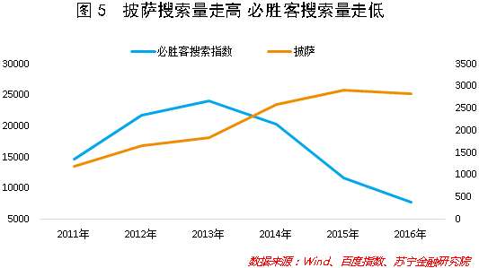 與此相似,必勝客以披薩為主打,但其他披薩店也對必勝客的銷售形成了分流。表現(xiàn)在數(shù)據(jù)上,就是披薩搜索指數(shù)持續(xù)提升,但必勝客搜索指數(shù)逐步下降(參見圖5)。