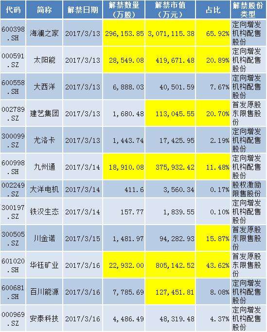 Wind資訊數(shù)據(jù)統(tǒng)計顯示,3月13日至3月17日預(yù)計有16家公司限售股陸續(xù)解禁,合計解禁46.30億股。按3月10日收盤價計算,本周解禁市值合計584.32億元。本周解禁數(shù)量超過1億股的上市公司僅有5家,分別為海瀾之家、新洋豐(000902.SZ)、太陽能(000591.SZ)、華鈺礦業(yè)(601020.SH)和九州通(600998.SH),其中海瀾之家多達(dá)近30億股。