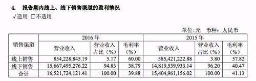 在海瀾之家毛利下滑的情況下,海瀾之家的銷售模式也存在爭(zhēng)議。2016年財(cái)報(bào)中顯示,海瀾之家的銷售渠道分為線上銷售與線下銷售,其中線上銷售的營(yíng)業(yè)收入為8.54億元,占比為5.17%,線下收入的占比為94.83%,不難看出,線上銷售占比并不大,線下銷售的模式才是海瀾之家服飾銷售的主要模式。